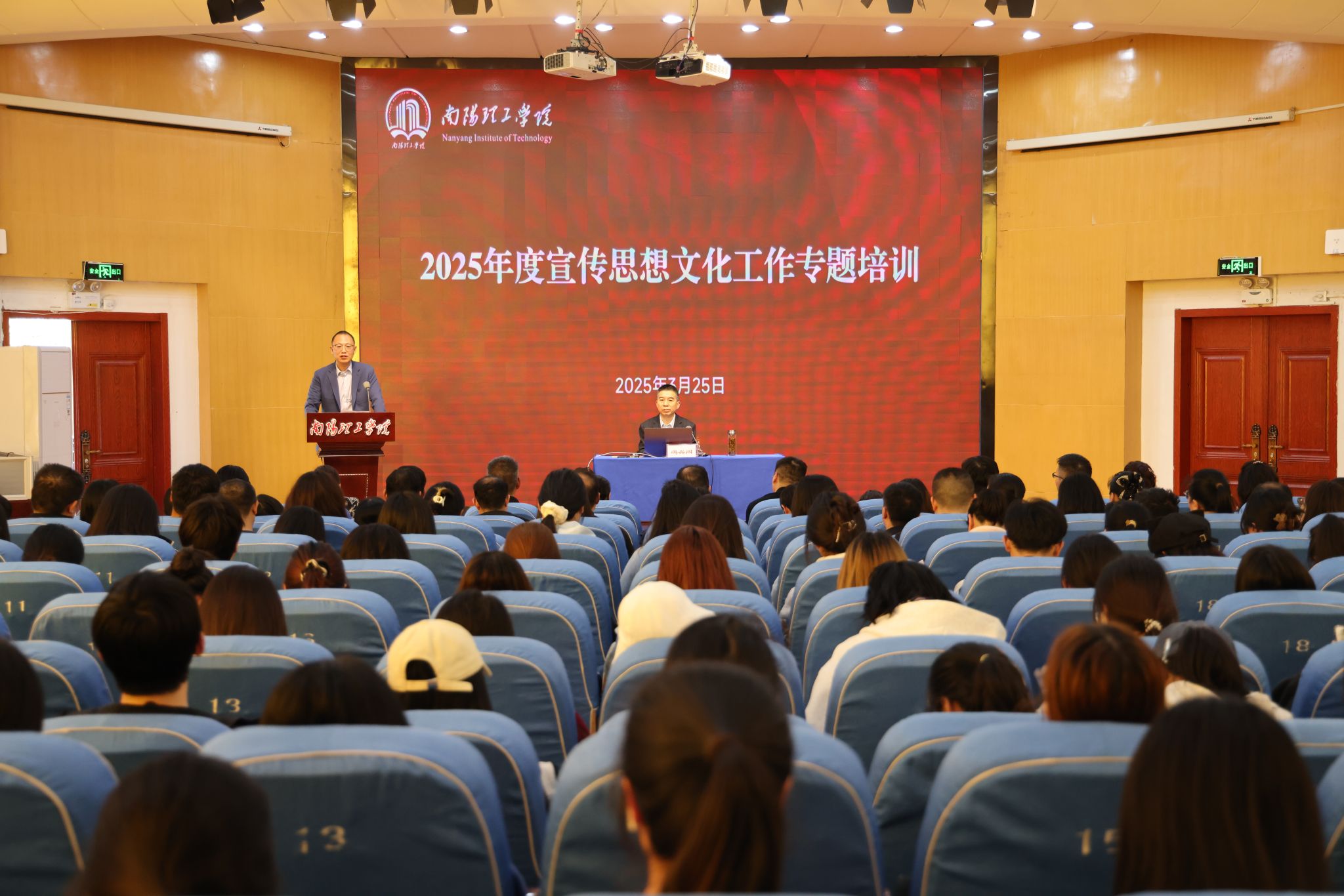 本网讯(记者/鲁静薇 学生记者/胡秋阳)为加强新闻宣传工作队伍业务能力,提高宣传思想文化工作的质量和水平,3月25日下午,安博官方网页版在领创空间二楼报告厅举办2025年宣传思想文化工作培训专题讲座。讲座由南阳日报社编委、高级编辑冯兴阁主讲。党委宣传部部长逯忆主持讲座,党委宣传部全体人员、各学院相关负责同志及师生代表300余人参加培训。