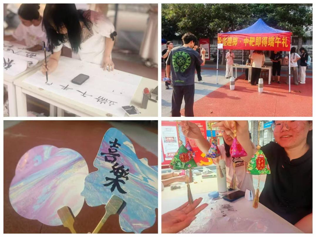 此次活动设置知识问答、漆扇制作、书法创作、五彩绳编制、端午投壶、DIY艾叶香包六大文化体验区,现场热闹非凡。在端午节相关知识问答环节,同学们通过抢答问题和背诵《离骚》经典片段,展现对传统文化的热爱;在DIY艾叶香包区域,同学们亲手填充香料,装饰点缀,每一个细节都透露出对古老习俗的敬意;漆扇制作区则展现了同学们的艺术创造力,一把把色彩斑斓、图案精美的漆扇在同学们手中诞生,成为了独特的端午纪念品。
