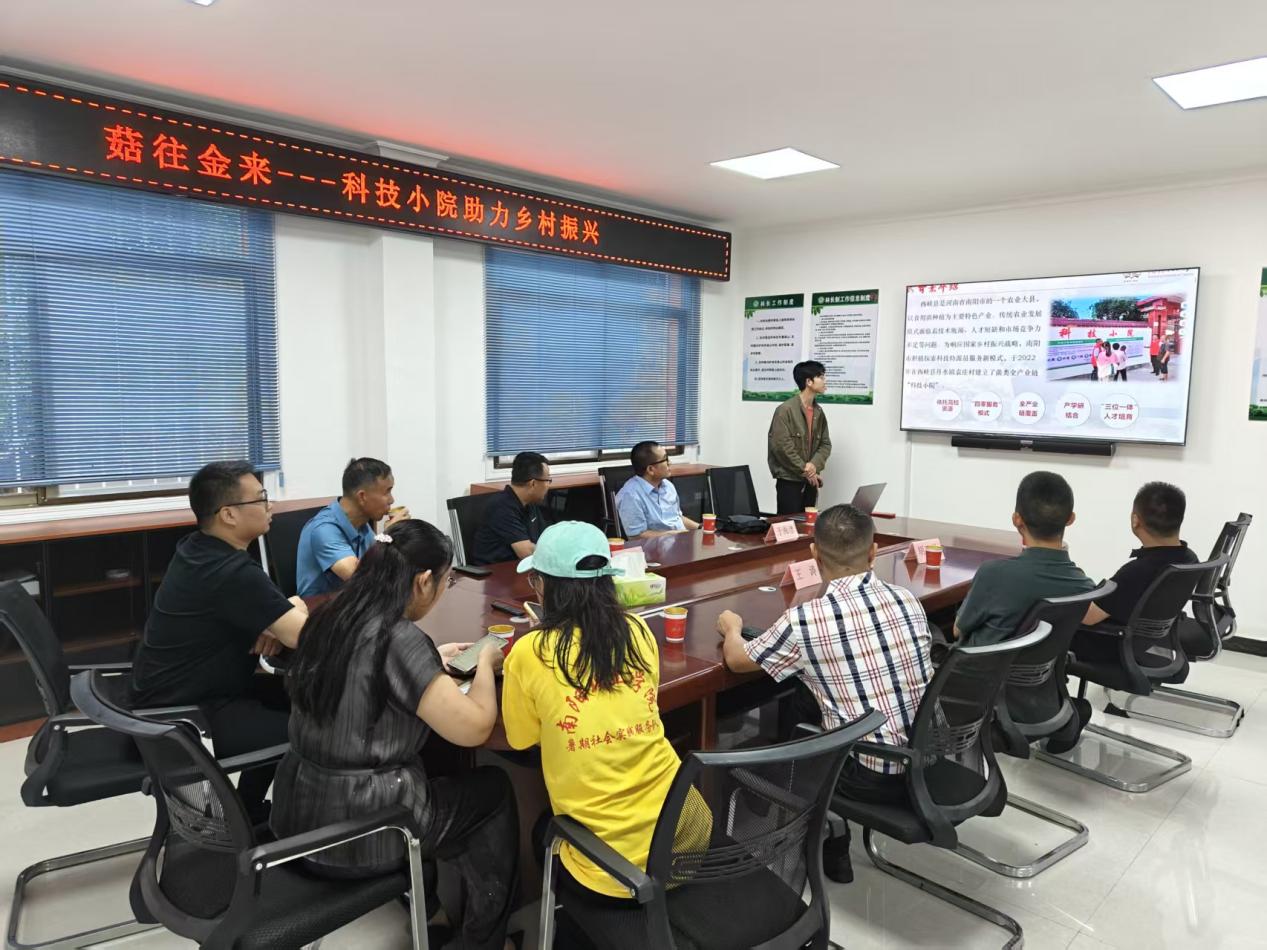 桐柏县科技局局长王涛、朱庄镇党委书记刘永涛,桐柏县百菌香食用菌有限公司和桐柏县阳阳生物科技有限公司负责人带领师生考察菌菇分选、生产、接种车间,并开展座谈会。