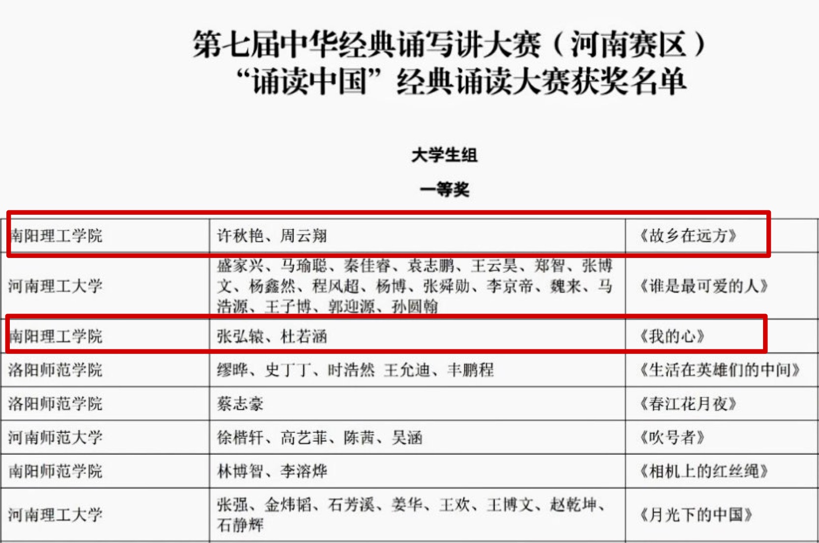 本网讯(特约记者/吴倩倩)8月13日,河南省教育厅公布第七届中华经典诵写讲大赛(河南赛区)“诵读中国”经典诵读大赛评选结果。我院播音与主持艺术专业选送的两部作品脱颖而出:2022级许秋艳、周云翔同学的《故乡在远方》与2024级张弘辕、杜若涵同学的《我的心》双双荣获大学生组一等奖,并成功晋级全国复赛。其中,《故乡在远方》更是一举挺进全国总决赛,成为河南省大学生组仅有的3部入围全国总决赛的作品之一。