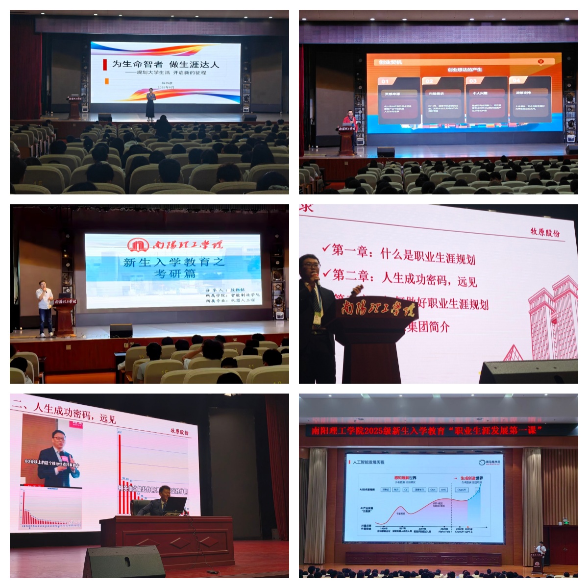 本次活动邀请校内外具有丰富职业指导经验的知名专家、优秀校友进行分享。全球生涯教练、人社部SIYB创业培训讲师,来自河南工业职业技术学院的薛书彦教授,结合《大学》理念,纠正新生对大学“轻松自由”片面认知,提出“大一博业通业、大二大三择业试业、大四迁业求业升学”的分阶段发展建议,引发新生强烈共鸣。优秀校友高明(河南明铂尔不锈钢有限公司董事长)、杨俊鹏(牧原食品股份有限公司饲料数智化负责人)、申帅廷(牧原食品股份有限公司装备制造负责人)分别从自身经历出发,分享了从校园人到职场人的转变与成长。传智教育刘亚伟聚焦《AI时代职业选择指南》,为计算机与软件学院学生分享了IT行业发展趋势,从专业与职业角度分享了AI时代的职业规划路径。青年教师殷伟铭博士则围绕入学深造,分享了考研、考博的实战经验。