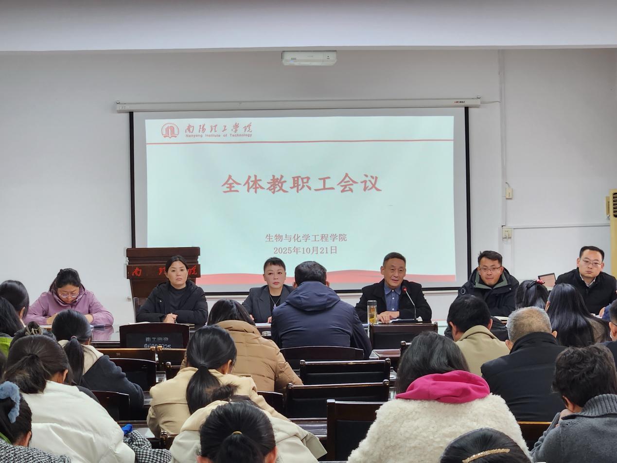本网讯 (通讯员/王莹)10月21日下午,生物与化学工程学院召开全体教职工会议,启动科技创新团队优化重组,进一步凝聚科研优势力量,凝练学科研究方向,打造特色鲜明、创新能力突出的科技创新团队,切实提升学院科技创新能力和成果转化水平。这也是学院学习贯彻二十届四中全会精神、落实学校“优化学科学院布局”专项改革任务、促进重点学科与专业硕士学位点建设高质量快速发展的有力举措。