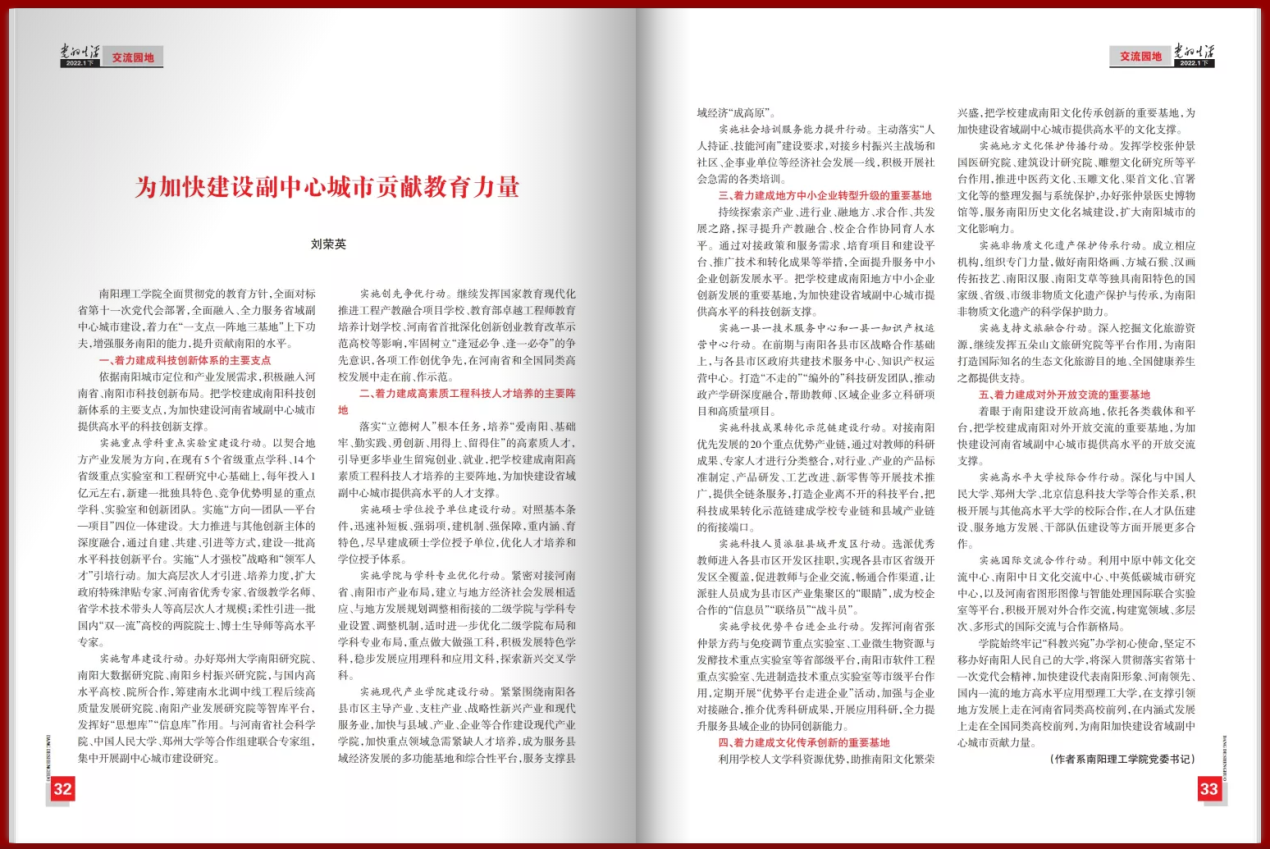 编者按:2022年1月,中共河南省委主管主办的《党的生活》杂志2022年第1期(总第666期)(下)刊发了我校党委书记刘荣英教授的文章,题为《为加快建设副中心城市贡献教育力量》。部分内容摘要如下: