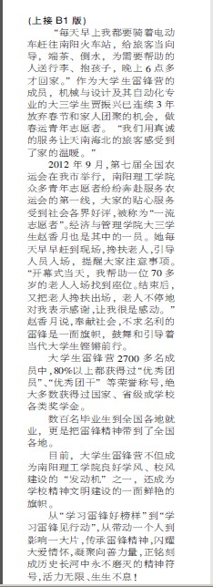 “每天早上我都要骑着电动车赶往南阳火车站,给旅客当向导,端茶、倒水,为需要帮助的人送行李、抱孩子,晚上6点多才回家。”作为大学生雷锋营的成员,机械与设计及其自动化专业的大三学生贾振兴已连续3年放弃春节和家人团聚的机会,做春运青年志愿者。“我们用真诚的服务让天南海北的旅客感受到了家的温暖。”
