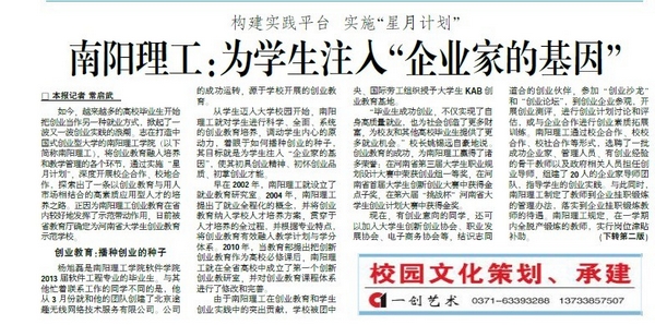 “星月计划”:为学生创业打下基础用长远的战略眼光关注学生的未来。2011年年初,学校全面启动“星月计划”,该计划要求全校所有院系均要加强与南阳市及周边地区重点企业的联系,积极探索校企深度合作的途径和方法,建立稳定、对等、密切的就业(见习)基地和创新创业基地。