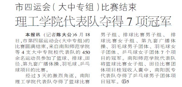 本报讯(记者陈大公)6月18日,市第四届运动会(大中专组)的比赛圆满结束,来自南阳师范学院等4支大中专院校代表队的450余名运动员参加了篮球、排球、田径、第九套广播体操、羽毛球、乒乓球项目的比赛。