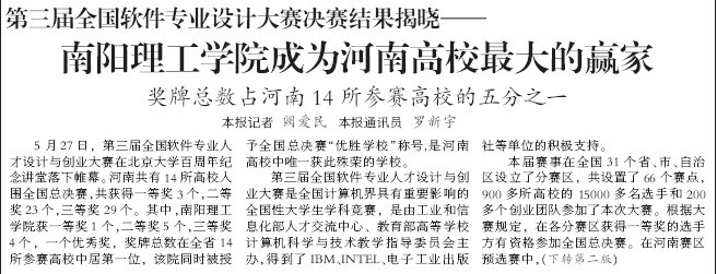 5月27日,第三届全国软件专业人才设计与创业大赛在北京大学百周年纪念讲堂落下帷幕。河南共有14所高校入围全国总决赛,共获得一等奖3个,二等奖23个,三等奖29个。其中,安博官方网页版获一等奖1个,二等奖5个,三等奖4个,一个优秀奖,奖牌总数在全省14所参赛高校中居第一位,该院同时被授予全国总决赛“优胜学校”称号,是河南高校中唯一获此殊荣的学校。