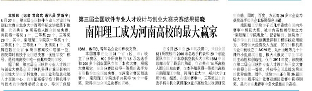 据了解,第三届全国软件专业人才设计与创业大赛是全国计算机界具有重要影响的全国性大学生学科竞赛,由工业和信息化部人才交流中心、教育部高等学校计算机科学与技术教学指导委员会主办,得到了包括IBM、INTEL等知名企业的积极支持。