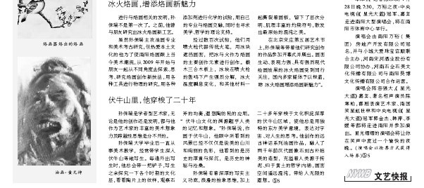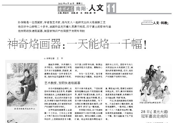 作为一位艺术家,他有着学者的独立与超脱,热衷研究南阳本土文化。前些年与友人共同创出冰火烙画新工艺,被国内多家媒体报道。近日,他发明的快速烙画器又被国家知识产权局授予发明专利权。