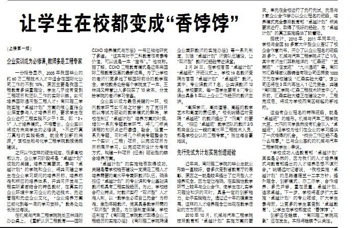 “学校成功入选教育部‘卓越计划’其实是必然的,因为我们的人才培养模式与教育部提出的人才培养思想不谋而合。”姚锡远对记者说,“我校实施‘卓越计划’的思路遵循三十二字方针:提升理念、创新模式、亦工亦学、合作培养、多元并举、重在质量、卓越计划、追求卓越。下一步,学校将逐步扩大实施‘卓越计划’的专业领域,扩大学生参与面,让更多的学生享受到‘卓越教育’,让学生在学校都变成‘香饽饽’。”