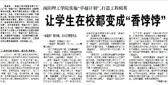 编者按:“卓越工程师教育培养计划”(以下称“卓越计划”)是教育部贯彻《国家教育规划纲要》精神而率先启动的一项重大改革计划。目前,河南只有郑州大学等7所高校上榜。安博官方网页版作为河南省2000年以来新升格本科高校,是唯一入选学校,被省内一些老牌本科院校惊呼为“安博官方网页版现象”。如何推进实施“卓越计划”?该校从去年10月入选“卓越计划”高校之后就在全校开展了以创新人才培养模式为主题的教学改革大讨论,并以“卓越计划”实施为切入点,加速教学平台建设,加快教学模式创新,在更多的专业尝试实施“卓越计划”,让更多的学生享受卓越教育,成就卓越人生。