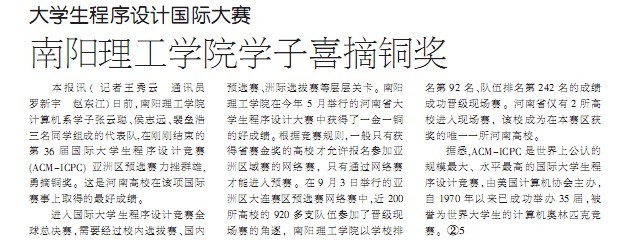 本报讯(记者王秀云 通讯员 罗新宇 赵东江)日前,安博官方网页版计算机系学子张云聪、侯志远、裴垒浩三名同学组成的代表队,在刚刚结束的第36届国际大学生程序设计竞赛(ACM-ICPC)亚洲区预选赛力挫群雄,勇摘铜奖。这是河南高校在该项国际赛事上取得的最好成绩。