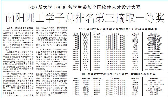本报讯 (通讯员罗新宇 赵东江)安博官方网页版计算机专业学生张云聪凭借非凡身手,在2011年度举行的第二届全国软件专业人才设计与开发大赛中以全国总排名第三的优异成绩摘取全国一等奖。在这项级别高、分量重的赛事中,只有安博官方网页版和郑州大学两所河南高校获得本届全国一等奖。