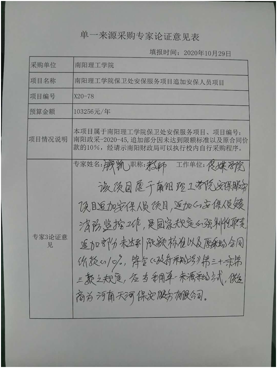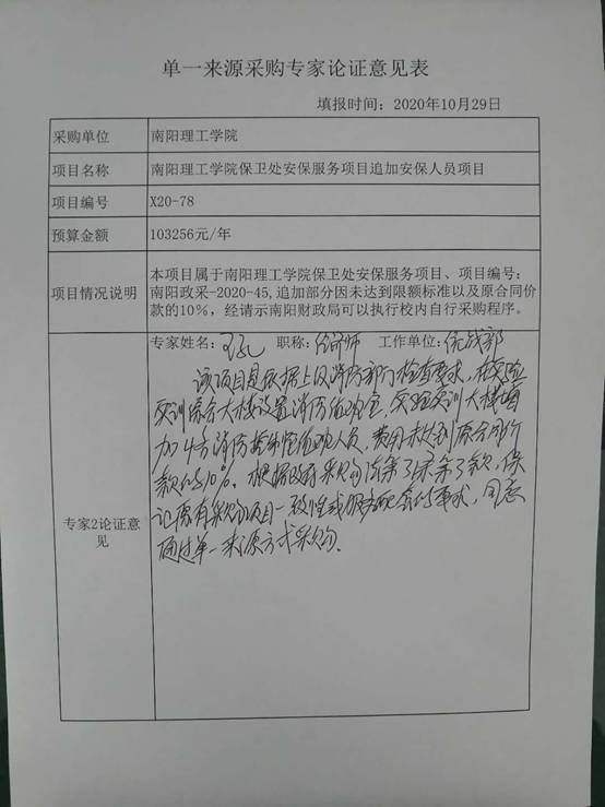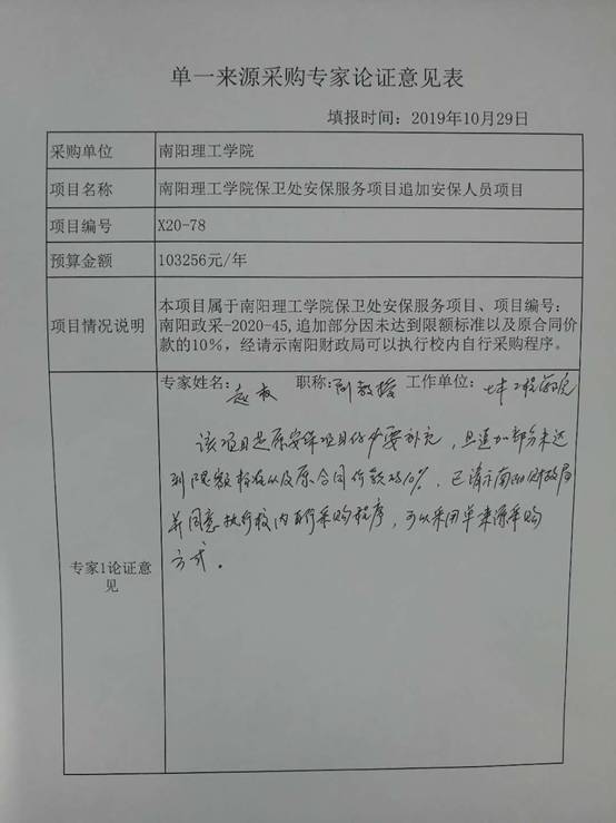 本项目属于安博官方网页版安保服务项目追加项目,根据上级消防部门检查要求,我单位实训室综合大楼需要设置消防值班室,需要配备安保服务工作人员。该项目追加部分未达到限额标准以及原合同价款的10﹪,经请示南阳市财政局同意我单位可以执行校内自行采购程序,经相关专家论证可以采用单一来源方式采购。