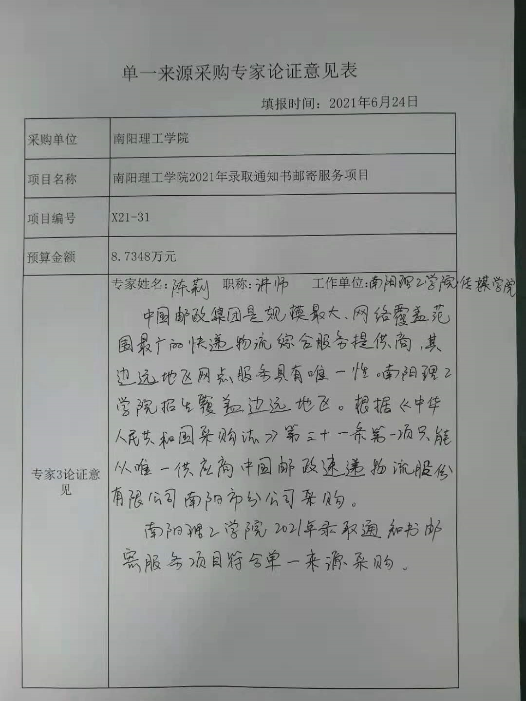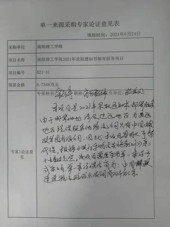 该项目来源单一,供应商为中国邮政速递物流股份有限公司南阳市分公司,根据《政府采购法》第三十一条第一款及《政府采购法实施条例》第二十七条之规定的“货物或服务使用不可替代的专利、专有技术,导致只能从某一特定供应商处采购”的要求,符合单一来源方式采购的条件。