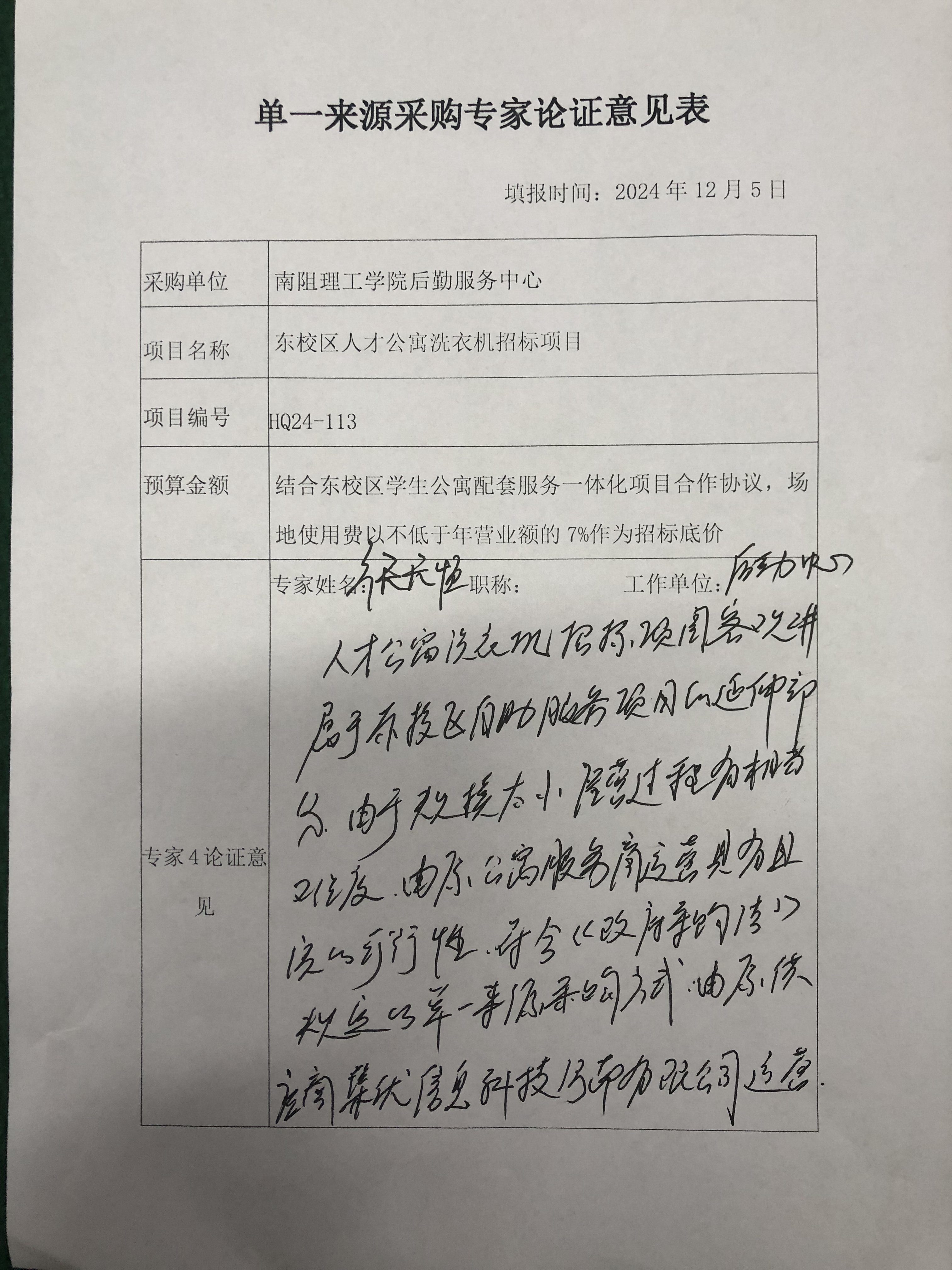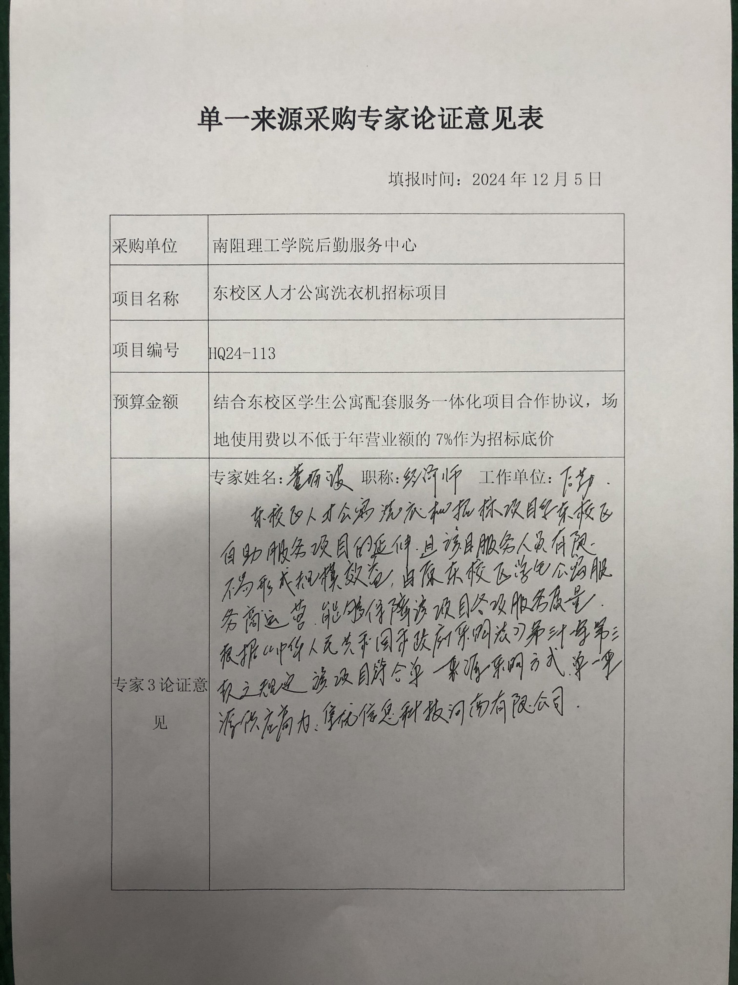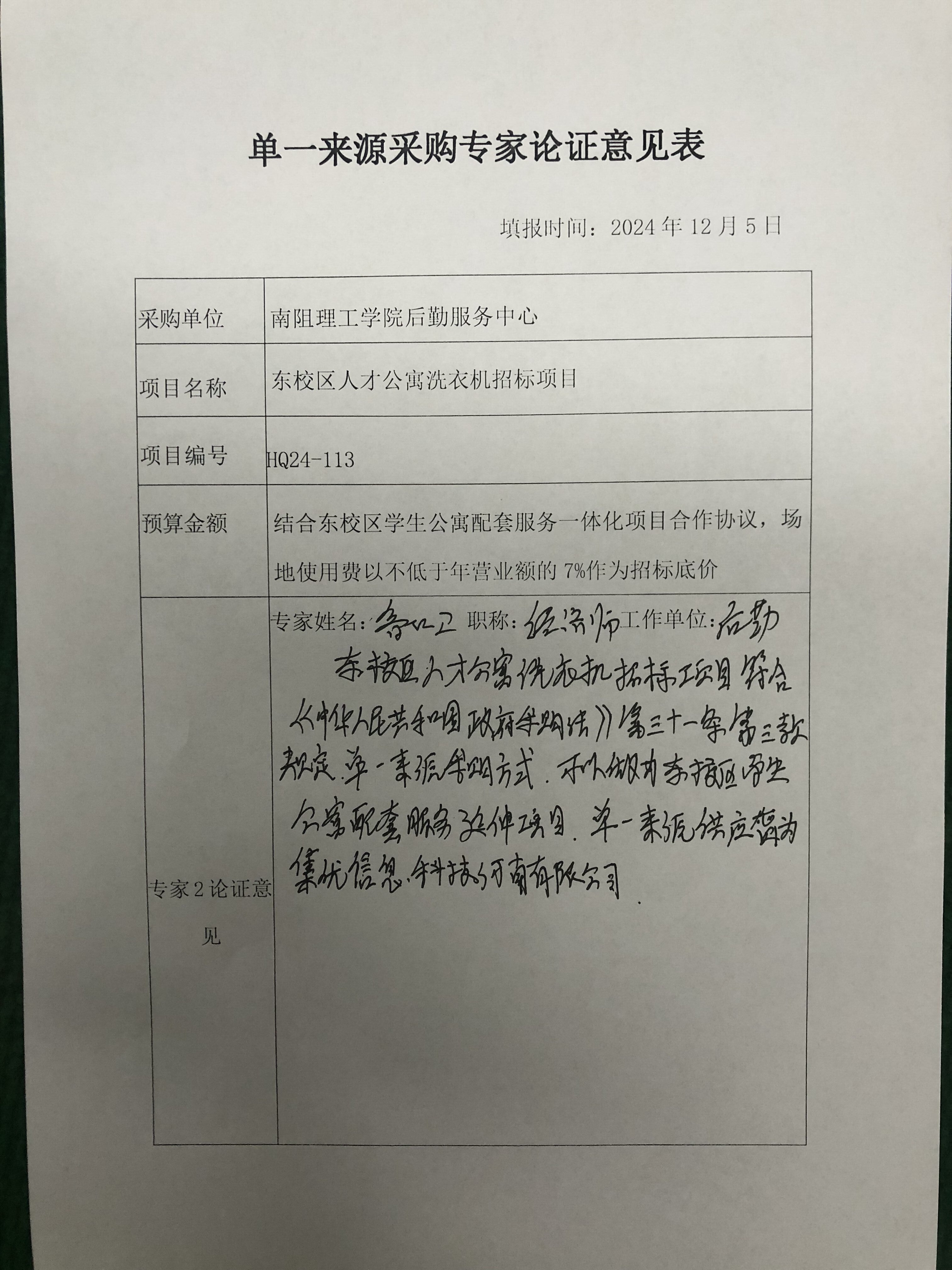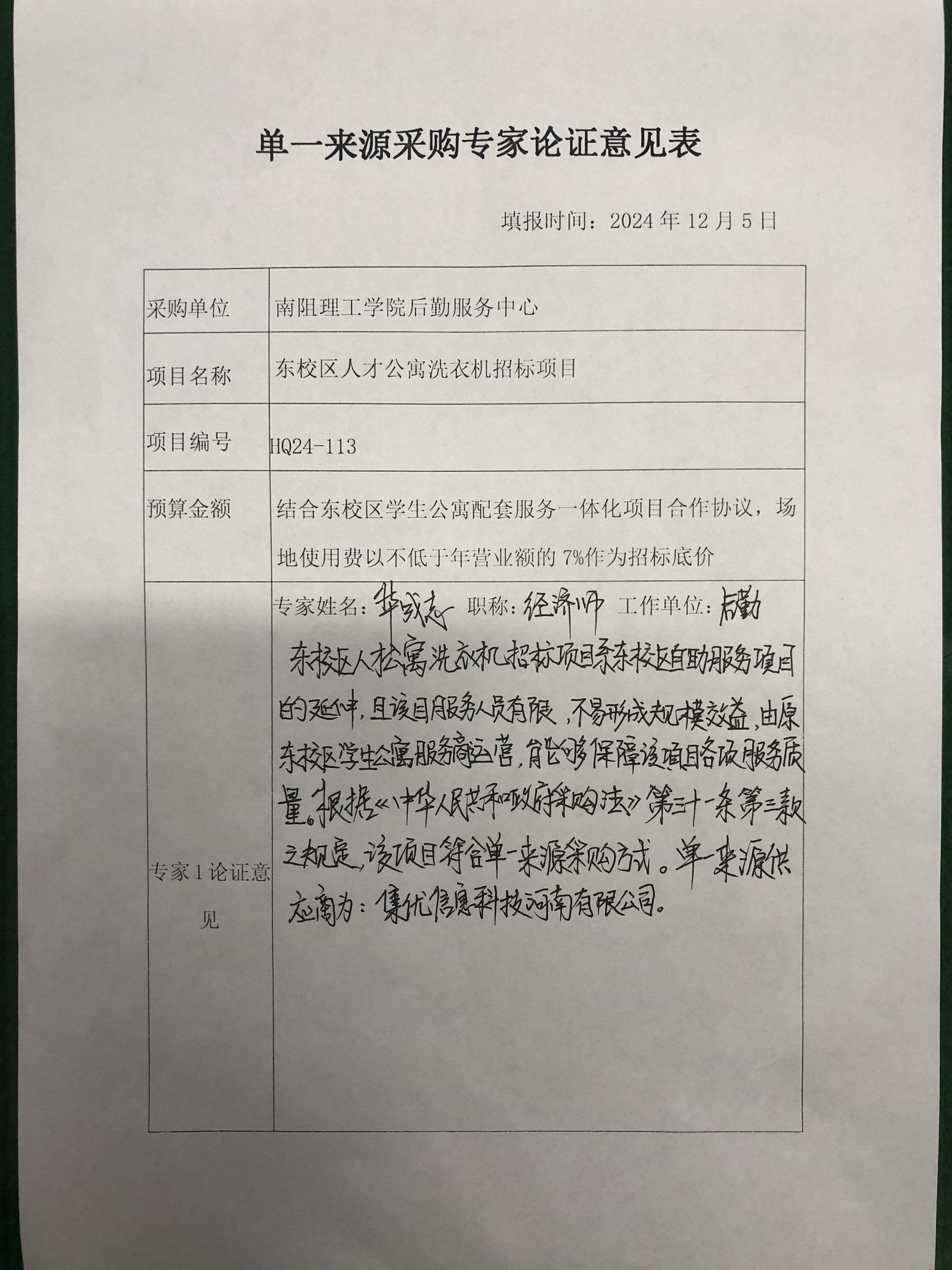 根据专家论证结果,结合东校区学生公寓配套服务一体化项目的合作协议,集优信息科技河南有限公司作为经营商为东校区学生公寓提供相关配套服务,其中包含自助洗衣服务项目。本项目作为自助洗衣服务项目的延伸,确定使用单一来源采购方式,由原东校区自助洗衣经营商集优信息科技河南有限公司继续安装设备提供服务。结合东校区学生公寓配套服务一体化项目合作协议,场地使用费以不低于年营业额的7%作为招标底价,具体以招标成交价为准。单一来源供应商为:集优信息科技河南有限公司。
